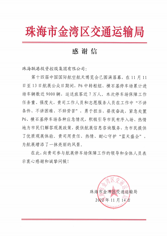 珠海市金灣區(qū)交通運輸局向聯(lián)港集團參與航展停車場保障工作的領(lǐng)導(dǎo)和全體人員表示衷心感謝和誠摯問候!
