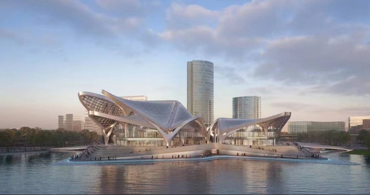 扎哈遺作,金灣地標(biāo)。金灣航空城市民藝術(shù)中心位于金灣航空城中心湖正中心,四面濱水,金帆大道下穿而過(guò)。總建筑面積99582.39平方米,共有四棟建筑物,分別為1200座的大劇院、500座觀眾的多功能廳、4000多平方米的藝術(shù)館、7000多平方米的科普館。